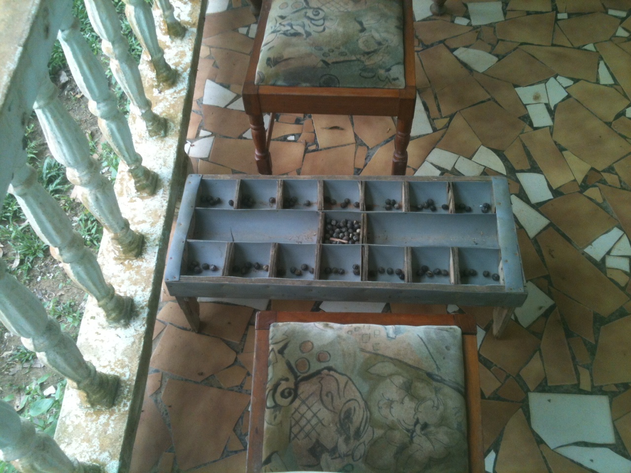 Here amoung the Fang of Gabon it is called Songo and as the picture shows there are 7 “houses” per side and each player starts with 35 seeds from a local tree and the object is to capture more seeds than your opponent. It is deceptively simple which leads to very complex strategy. This particular game is located on the veranda of our host and I received excellent instructions, “Play Andre (as I am known here) and see what happens.” I am pretty good at counting, so I thought I had a chance. NOT. I got whipped. But I could for sure have another games as we had seen a similar set in the “corps de garde” (a village meeting house) in Belleville where we walked two weeks ago.