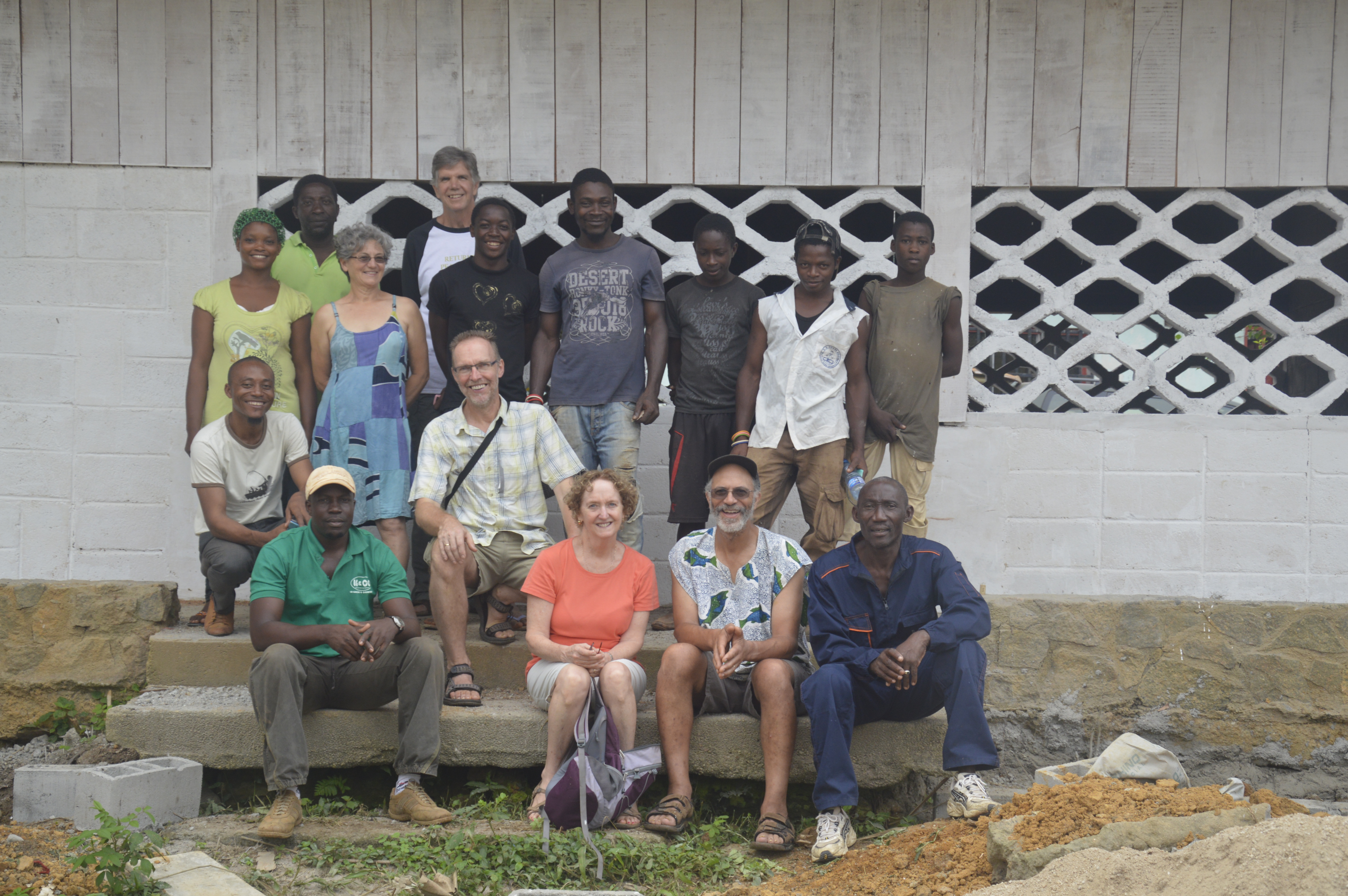 The photos here are of Terrence working the pump, balancing two jugs so that the opening of the top jug fits right over the spout, wasting as little water as possible. There is a photo of the terrace under construction this week, and a group photo of all the workers, taken shortly before Mary, Henk and John joined Bob and Gaston for the ride back to Libreville.