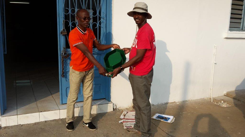 Preparations proceed. Seen here is M. Eyene Ntoutoume Benoit handing over a new window block mold that he made in his welding shop in Libreville. Accepting the mold is M. Nguema Essone Jacques, who serves as the Vice-President of “Comitee Sam d’Abord,” which is partnering with Encore de la Paix in the school renovation project. He will send the mold out to start making the new window blocks, so they are on hand when the first of the U.S. volunteers arrives.
