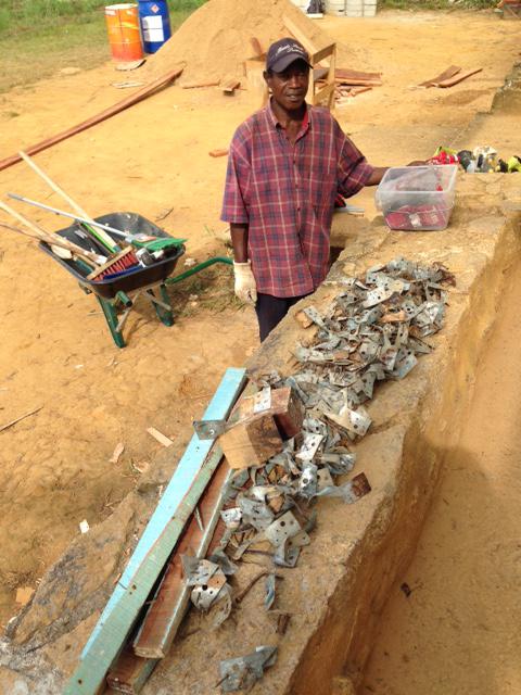 Pictured here is Yves, who is the caretaker at the house where Drew and Claire are staying. Desiree (with an accent at the end) is a neighbor of the school and he is strong and skillful. Xavier showed up and reminded us he helped in Doumandzou last year for the first week, but he’s from here. Floriant is our driver but he pitches in, even through a minor bout of malaria. The first day two women – Hortense and Marie Therese – were helping with the demolition. Somewhere we have a photo of Marie Therese removing rotten wood while continuing to clutch her pocketbook. With Christian and Eko we have a good number working on the different areas.