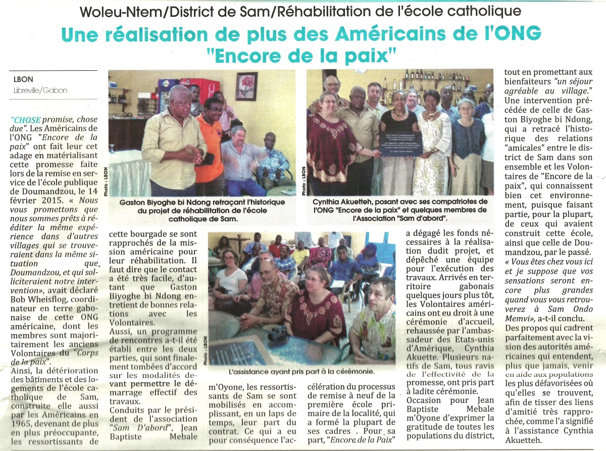 March 14 article in L’Union on Libreville ceremony before work started on Sam school